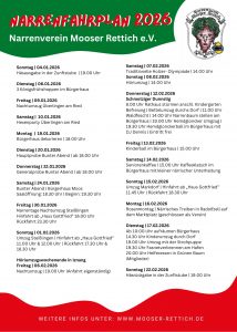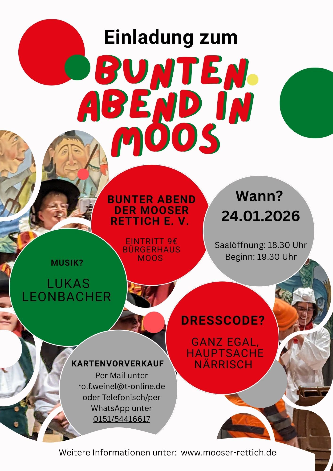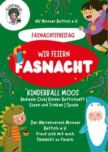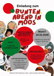 Zur Förderung, Gestaltung aber letztlich auch zum Erhalt des Fasnetsbrauchtums wurde 1953 die Narrenzunft Mooser Rettich gegründet. Unter der Leitung von Nobert Heine wurde im Januar desselben Jahres die erste Narrenversammlung abgehalten, welche er mit den Worten „Rettich Bülle und Salot, gnueg, gnueg, gnueg. Narri – Narro!“ schloss.